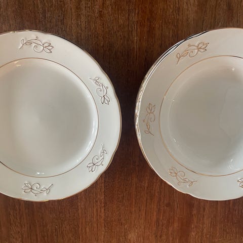 To store serveringsfat og en serveringsbolle selges rimelig. Gullkanten rundt er slitt noen steder, men de er pene i glasuren og har ingen skader.