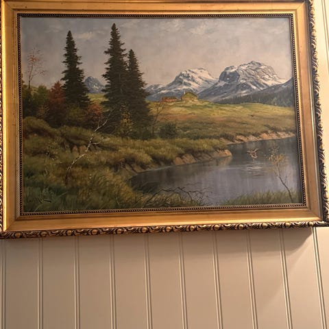 Størrelse med ramme: bredde 89 cm, høyde 60 cm. Selve maleriet er i bra stand, malingen har flasset av på enkelte steder på rammen, er ikke særlig synlig når det henger på veggen. Må hentes på Gressvik.