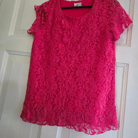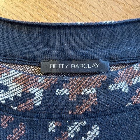 Topp med korte ermer fra Betty Barclay. 95% viskose, 5% elastan. Stoff med litt tyngde som faller fint. Ubrukt. Dessverre har jeg tatt av lappen. Det første bildet viser riktigst farge.