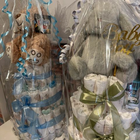 🌟 priser fra 300 kr, dette er standar oppsett 2-4 etasjer’s kake med, bleier og bånd på alle etasjer pakket inn i cellofan.