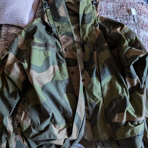 Jakken er som ny, har masse lommer, ventilasjonsåpninger under armene, hue i nakke.