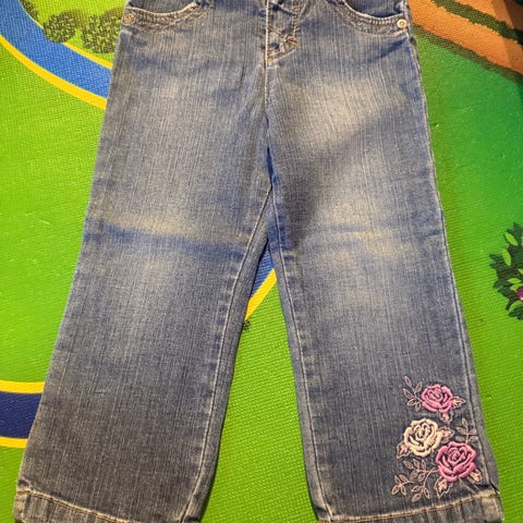 Pent og lite brukt. Lommer foran og bak. . Sydde blomster på lommene foran og nederst på buksene.