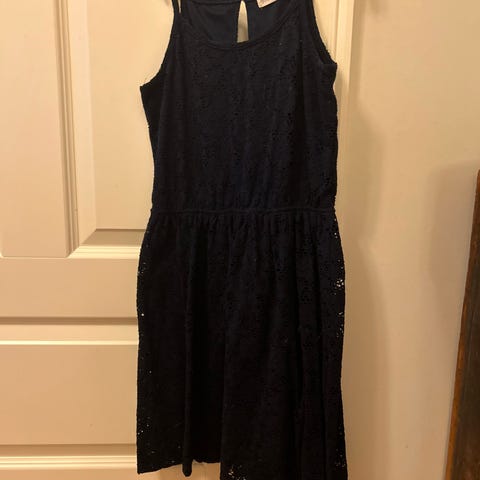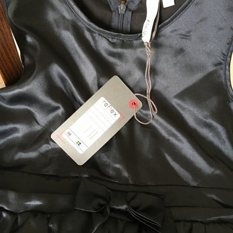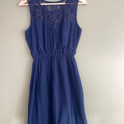 Blå kjole med blomstermønster, som aldri har blitt brukt før den ble får liten.