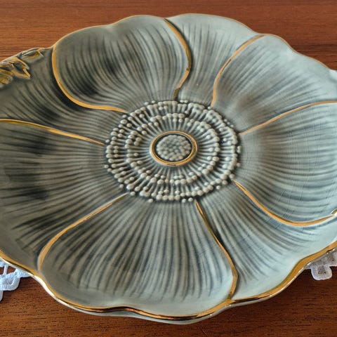 Et nydelig stort fat fra fra AWF (Arnold Wik Fabrikker). Ingen hakk. Dessverre er det ikke hull bak, som gjør at fatet er vanskelig å få hengt opp. Men med litt praktisk sans er det mulig å få til. Vi har hatt fatet til pynt i en tallerkenhylle.