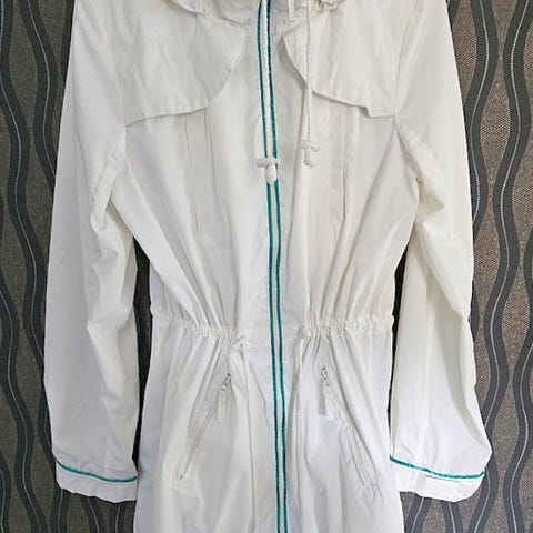 Lang jakke str 38/40 i flott rødfarge, med mønster på ermene og knytting fremme.
