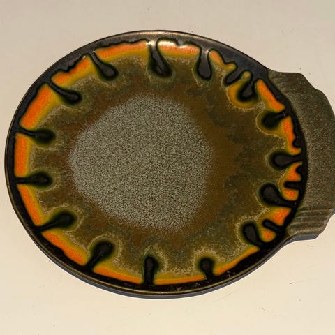 Charming chamotte tray in vivid colors made by Thomas Toft at his own studio in Bisserup near Næstved, Denmark. Monogram signature, 1960s. The studio was established in 1957 and he worked there for 50 years. Asking price NOK 400 or best offer.