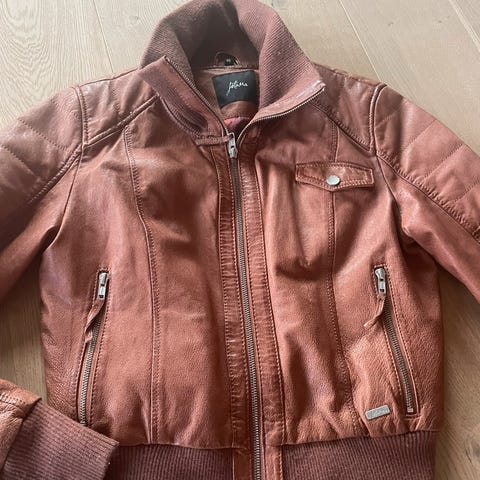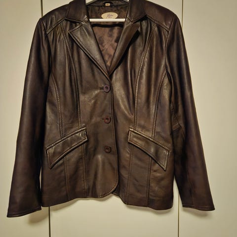 Kort jakke i ekte skinn fra Jofama, sort, vintage-stil, str. 42, men ikke stor, lite brukt. Praktisk og kan brukes både til kjole og bukse, fest og hverdag. Pris kr 250,- inkl. frakt