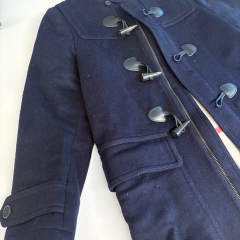 Mørk blå Burberry duffel coat str 14 år/164 selges.
