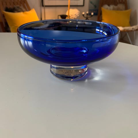 Dekorativ eldre skål av blått glass. Jeg tror, at den er eldre Hadeland produksjon.