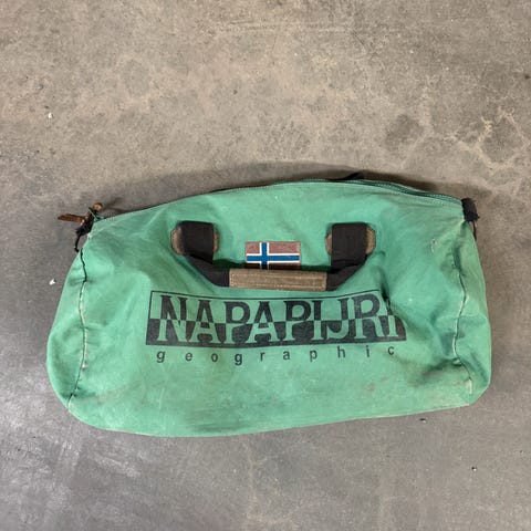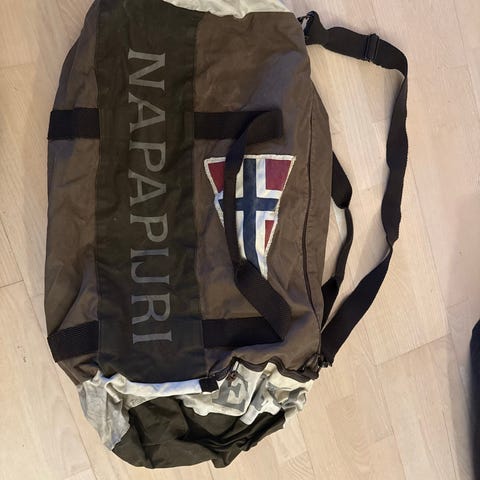 Orginal NAPAPIJRI Bag med glidelås lomme på siden, står ingenting om størrelse tipper 40-50l, høyden 60cm diameter 30cm.