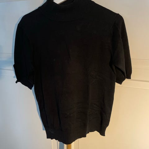 Fin sort topp med fløyels hals og fløyels striper str. L fra Claire. Toppen er strechy i 88% Polyester, 12 % Lycra med korte ermer. Vaskbar på 40 grader. Nyvasket og pent behandlet.