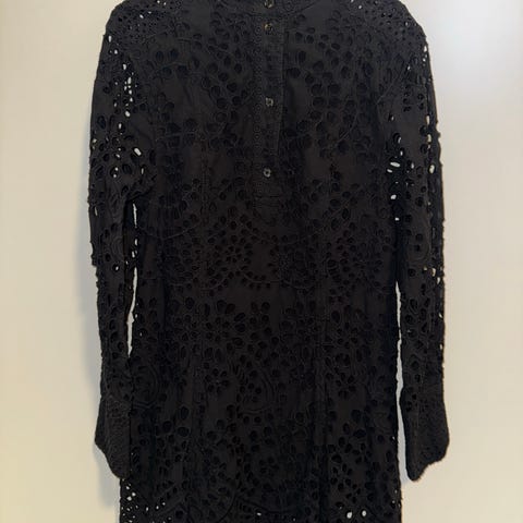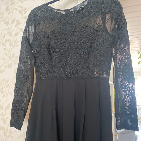 Superkul og søt sort kjole med blinder og broderi/brokadeaktig i overdelen, lange ermer. Sort skjørt som faller fint, litt chiffongaktig. Glidelås bak. Kun brukt en gang pga feil størrelse.
