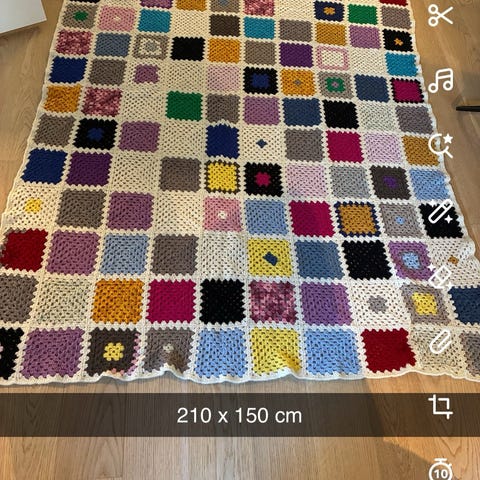 Egendesignet heklet ullteppe som det kun finnes et eksemplar av. Teppet er i fargene varm hvit, lysegrå og mørkegrå. (Det er aldri brukt, men har ingen merkelapp da jeg har laget det selv)