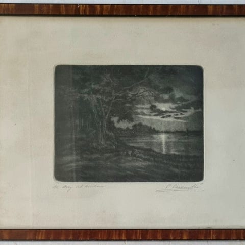 Jacques Lamy print av maleri av et fruktfat, med glass og ramme. 23,6 x 11,8 innvendig rammemål. 25 x 13 cm utvendig rammemål.