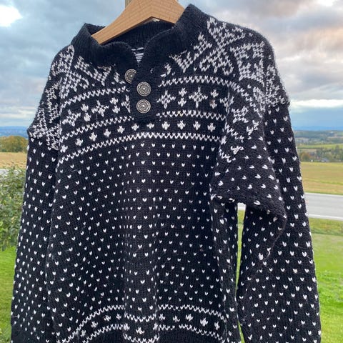 Strikket med utgangspunkt i mønsteret til Theogenseren. Strikket i to ulike kvaliteter merinoull fra Pickles. Ca str 2-4 år.