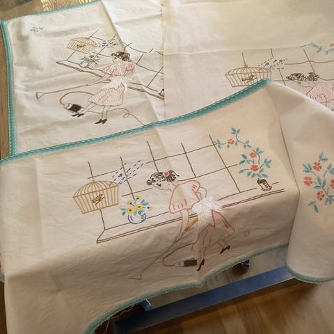 Håndbrodert eldre duk til bruk på pyntestang på f.eks kjøkkenet på hytta. Full lengde er 120 cm lang og 58 cm bred når den er lagt ut. Denne brettes så slik som på bildet for å henge opp på en stang.