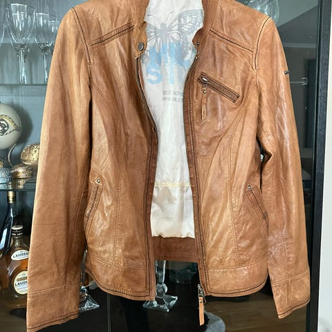Konjakkfarget skinnjakke. Ytterstoff i 100% svinenappa og linning: 100% polyester.