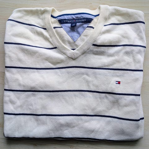 Hvit Tommy Hilfiger tskjorte med v-hals selges billig. Kun vært brukt et par ganger og er så god som ny.