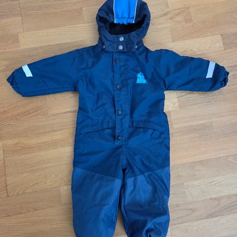Blå god vinterdress selges billig kr 100 pga 2 cm rift som er sydd (vist på et av bildene) på et sted som ikke vil ha noen stor betydning for bruken. Utover dette i god stand (bla knær og rumpe der slitasjen er størst). Str 1-2 år