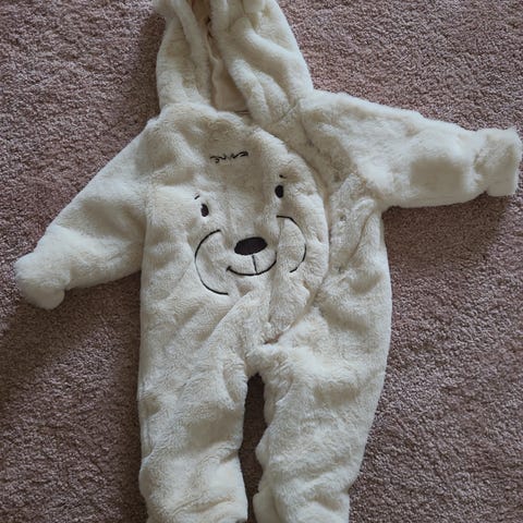 Supersøt varm myk dress med hette og føtter, tatt godt vare på, kjempekjekk for en liten jente.