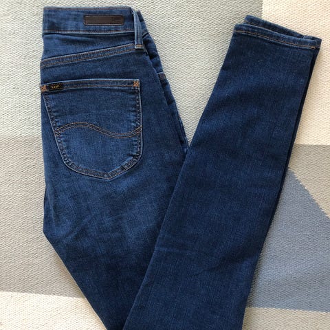 Nesten ubrukt Lee Scarlett str. 25x33. Mørk blå. Kun brukt noen få ganger da den dessverre er feil størrelse. Kan hentes, møtes i Oslo sentrum for overlevering eller sendes om kjøper betaler frakt.