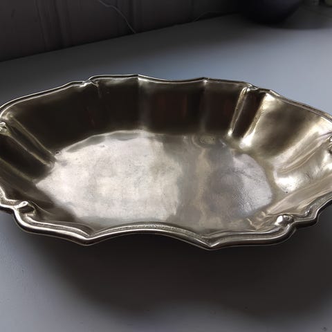 Flott ovalt fat i støpt massiv messing, merket HAUGRUD, kjøpt hos gullsmed Barth i Porsgrunn, selges.