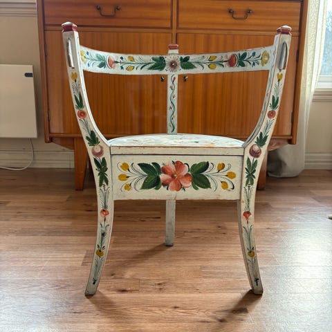 Bra stand, bortsett fra at den er overmalt. Sete 47 x 30 cm. Sittehøyde 45 cm. Høyde i rygg 67 cm. Kr. 999.-. + porto eller hentes.