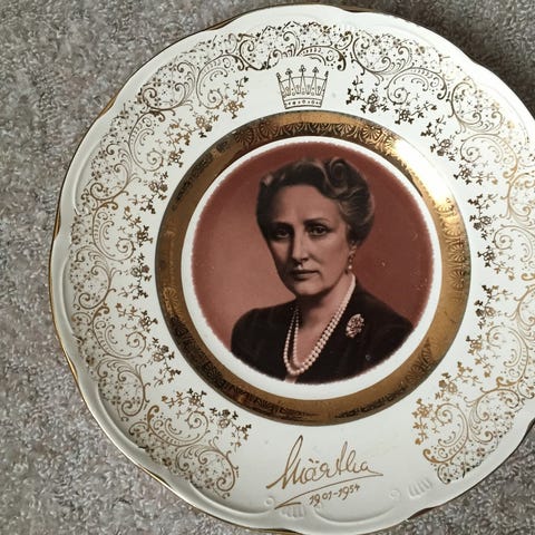 Selger dette fine minnefatet produsert i forbindelse med kronprinsesse Martha sin bortgang i 1954.Så dette fatet er 67 år.Fatet er arvet,pent tatt vare på,diameter på fatet er 28 cm.Der er også oppheng.Selges for 195kr.Hentes i Ålesund eller pakkes godt og sendes med Norgespakke,kjøper betaler porto enten 70kr (innenfor spesielle mål)eller 149kr.