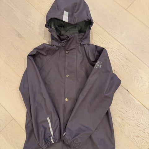 Str 12 år. Tynn vanntett jakke. Fin med refleks på. Snøring nederst. Avtagbar hette.
