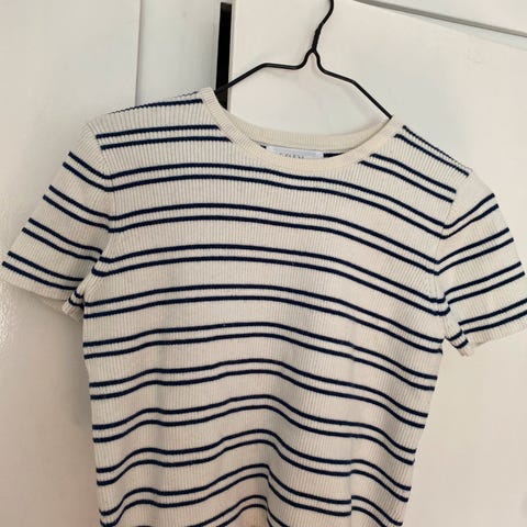 Pent brukt kort, hvit og svart stripete H&M topp str 10-12 år. Organisk bomull.