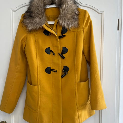 Lite brukt duffelcoat fra H&M Divided i str. 36 ( liten i størrelse) i veldig fin sennepsgul farge. Fuskepels på kragen. Vanskelig å få frem riktig farge på bilde. Selges til 250 kroner.