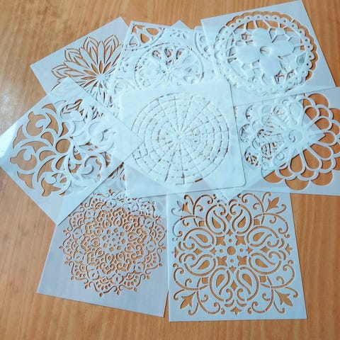 Selger fine sjablonger til maling og dekorasjon som er laget på en design salong.