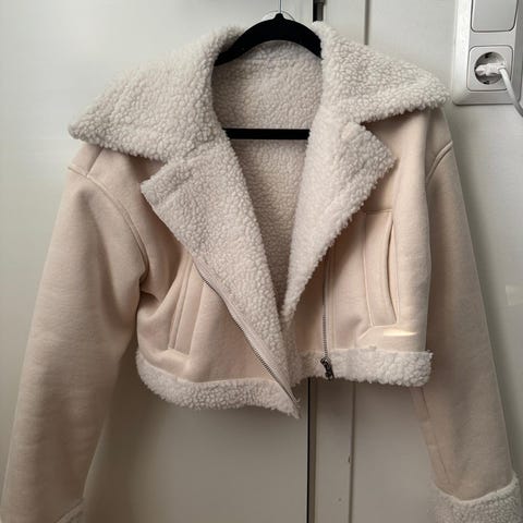 Kort jakke med teddyfor i ferskenfarget. Ikke brukt. Kjøpt på Zara. Str. Small. Mål: skuldre 46cm.lengde 52cm.underarm 38cm overarm 53cm. 100 % polyester. Kan vaskes. En lomme foran. Lukkes med trykknapper. Du kan kjøpe 5 ting for kr450 + porto