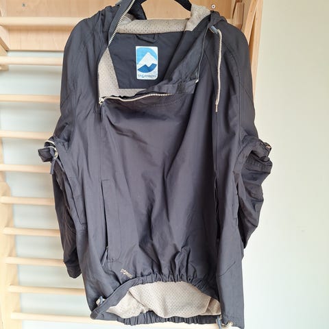En vid anorakk med fôret hette med snøring, skjult knappestolpe med trykk-knapper, lav skuldersøm og stor brystlomme med klaff. Sidesømmene er vendt mot fronten og inneholder diskrete sidelommer. Ufôret.