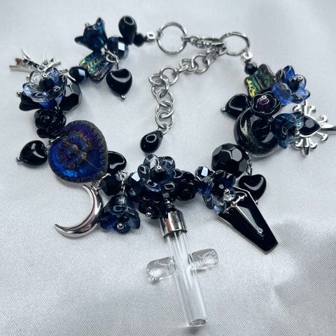 Armbåndet har lysblå akvamarinkrystaller og en stor glassperle, laget i eget verksted.