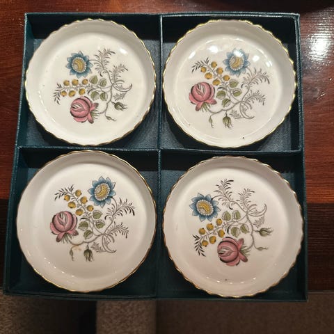 Kaffe servise til 4 helt strøkent med kopp og skål. 4 kake tallerken Middags service til 4 strøkent 4 suppe tallerken selges til høystbydende 2000kr