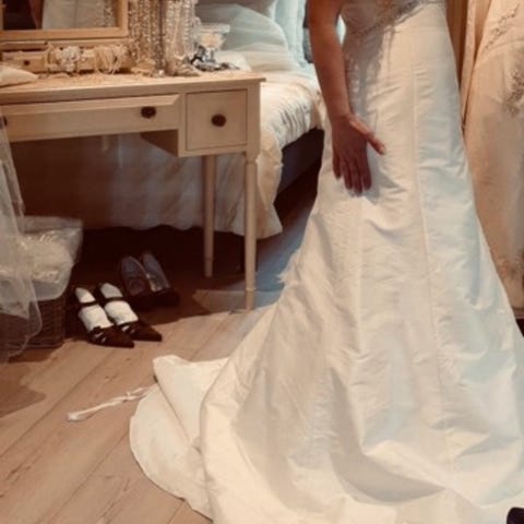 Kjolen ble kjøpt ny i en brudesalong, brukt en gang. Ny pris kr. 12.200,-