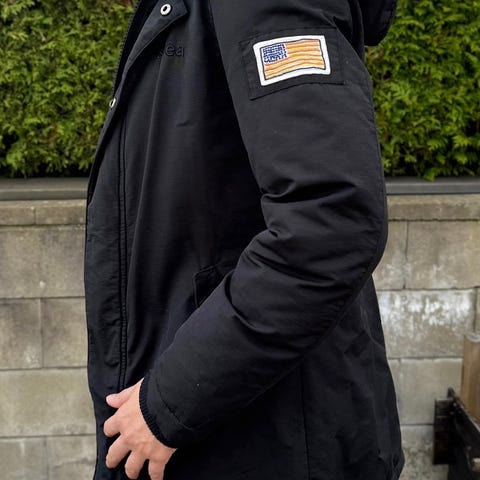 God og varm kvalitetsparkas med romslig pelshette (langhåret, myk, lys med svarte tupper). Ny pris: 3995,-. Har kun vært brukt én gang, femstår som ny.