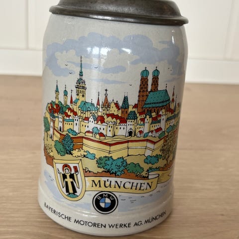 Keramisk musikalsk ølkrus. Høyde 22 cm. Mangler dessverre lokket. Motiv Brandenburger Tor. Rathaus. Dom. Gruss aus Berlin.