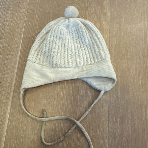 Hvit ulllue med fleece på innsiden. Ubrukt. Str 47-49. Nypris 400kr. Hbo 250kr. Kjøper betaler frakt.