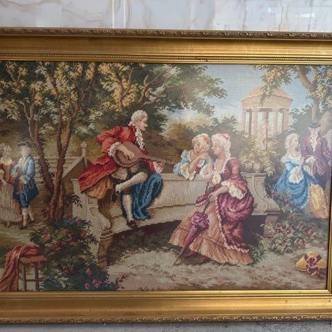 Et nydelig håndbrodert bilde med mindre sting på ansikt, hals og hender.