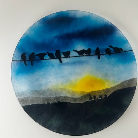 Flott signert glassfat med fuglemotiv 35,5cm dia. Evnt. tillegg for frakt.