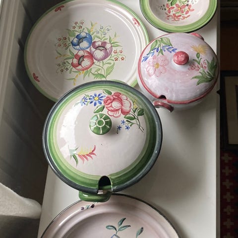 Fatet er helt, pent og blankt, uten bruksslitasje, noe svak krakelering. Undersiden har et par merker etter produksjonen langs kanten. Se bilder. 29cm i diameter, høyde 2,5cm.