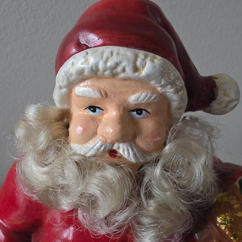 Koselig og dekorativ nisse i uglasert porselen.