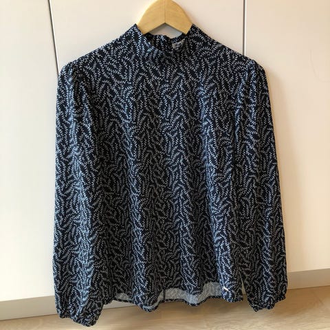 Chiffongbluse fra MAPP. Str. S. Farge mørkeblå m/hvite stjerner. Stoffet er litt transparent. Bredt felt med vaffelsøm nederst + på erme. . Nydelig bluse, med flott passform. Lettstelt, trenger ikke strykes. Ny med tags. Kvittering følger med. Ny pris kr. 500,-
