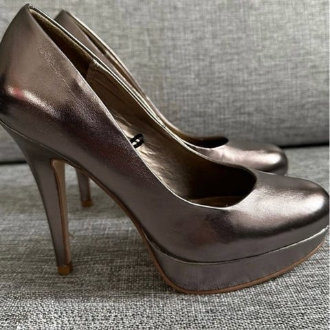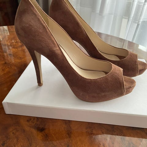 Grå, semsket Gucci sko med høy hæl og platå til salgs. Str 36. Meget pent brukt. Ingen skader.