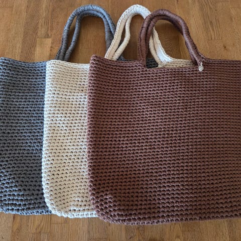Håndheklet handlenett til å ha over skulder. Høyde 40 cm, bredde 30 cm, hanken lengde 38 cm. Se også mine andre annonser for flere farger og størrelser.
