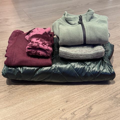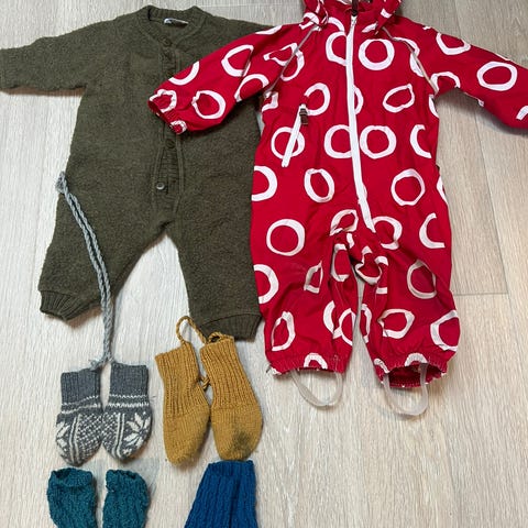 Pent brukt fleece dress, to ull genser, en ull skjørt,et par ull sokke, et par ull votter, to luer, en ull hals. Passer til 3 åring med str 98 . Røyk/dyrefritt hjem