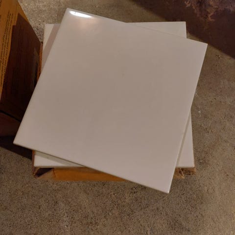 Som følge av oppussing av bad sitter vi igjen med en del fliser. Dette er matte, kalkaktige fliser av beste italienske kvalitet – se linkene for mer info. Vi ble superfornøyde (se bildet), men kjøpte altså alt for mye: