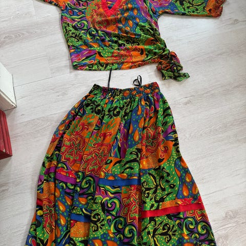 Kjole fra 80-tallet/90-tallet av chiffon med perlebroderier. Nydelig kjole som er like fantastisk nå som da den ble laget. Nydelig grønnfarge med blomstermønster og håndbroderte perler. Det brede livet i vaffelsøm gjør at kjolen kan passe flere størrelser. Den passer kanskje best til en M eller L nå, men kan være superfin til en S hvis den sys litt inn i vaffelsømpartiet (det er litt vidt/lite spenst)